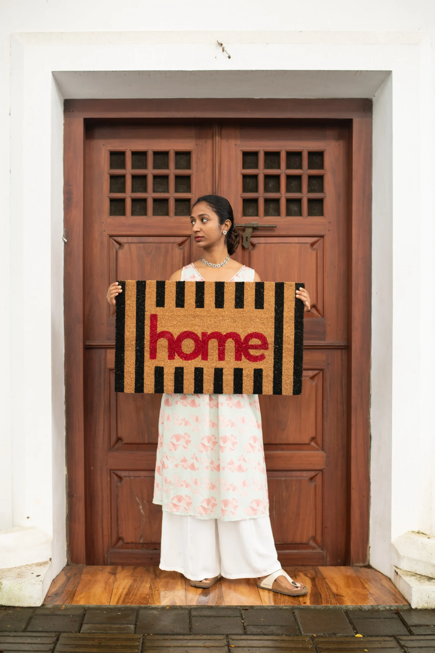 - Stylish “HOME” Print – Welcoming design with bold print and black stripes for modern entrances.